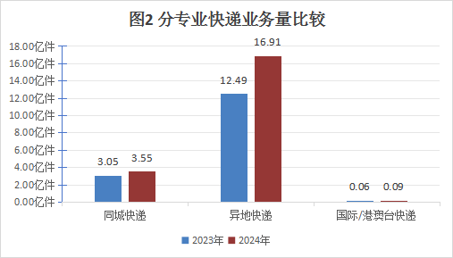 2024年,同城快递业务量累计完成3.55亿件,同比增长16.5%;异地快递业务量累计完成16.91亿件,同比增长35.38%;国际/港澳台快递业务量累计完成877.1万件,同比增长43.9%。