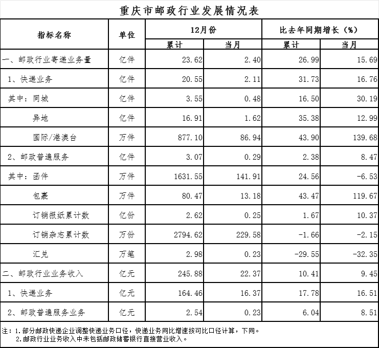 12月份,邮政行业业务收入完成22.37亿元,同比增长9.45%。其中,快递业务收入完成16.37亿元,同比增长16.51%。