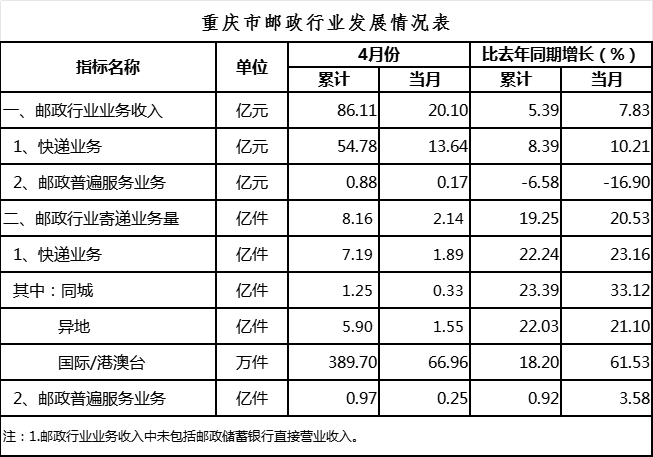 4月份,邮政行业业务收入(不包括邮政储蓄银行直接营业收入)完成20.1亿元,同比增长7.83%。其中,快递业务收入完成13.64亿元,同比增长10.21%。