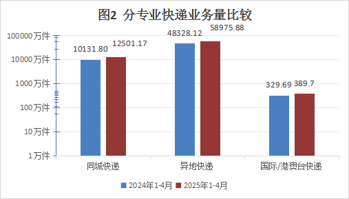1-4月,同城快递业务量累计完成1.25亿件,同比增长23.39%;异地快递业务量累计完成5.9亿件,同比增长22.03%;国际/港澳台快递业务量累计完成389.7万件,同比增长18.2%。
